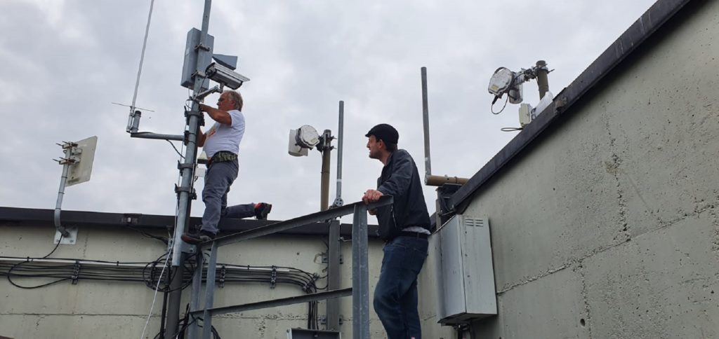 Am Sonntag den 2.8.2020 waren wir auf dem Dach des Bredero Hochhauses in der Innenstadt Hannover und haben den Empfänger für die Videolinkstrecke vom etwa 70km entfernten Standort des Amateurfunkfernsehrepeaters DM0MAX aufgebaut und das Signal temporär auf den 3,4 GHz Digitalsender (DVB-S) aufgeschaltet. Langfristig können wir so beide Umsetzer, also unseren in Hannover und DM0MAX im Wiehengebirge miteinander verkoppeln. Trotz der großen Entfernung kommt das Signal der Strecke knüppeldick an, sodaß wir eine gute Schlechtwetterreserve haben. Auf der Gegenseite werkelt ein zum Sender umgebauter LNB in einem Offsetspiegel, empfangen wird mit einer Hornantenne und nachgeschaltetem Bandpassfilter, um das Signal des eigenen Senders auf dem Hochhaus so stark zu dämpfen, daß es uns den Linkstreckenempfänger nicht zustopft. Vielen Dank an Michael