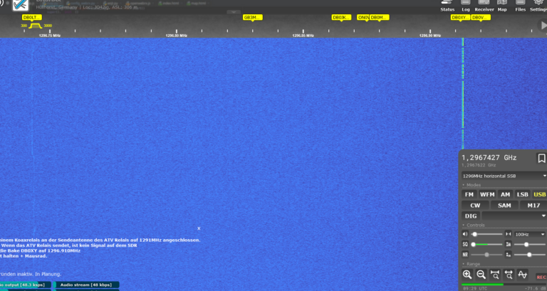 Der Bereich 1296-1299MHz ist mit einem Koaxrelais an der Sendeantenne des ATV Relais auf 1291MHz angeschlossen.Der Web SDR ist nicht bevorrechtigt. Wenn das ATV Relais sendet, ist kein Signal auf dem SDRIndikator für den Schaltzustand ist die Bake DB0XY auf 1296.910MHz. Diese ist mit…